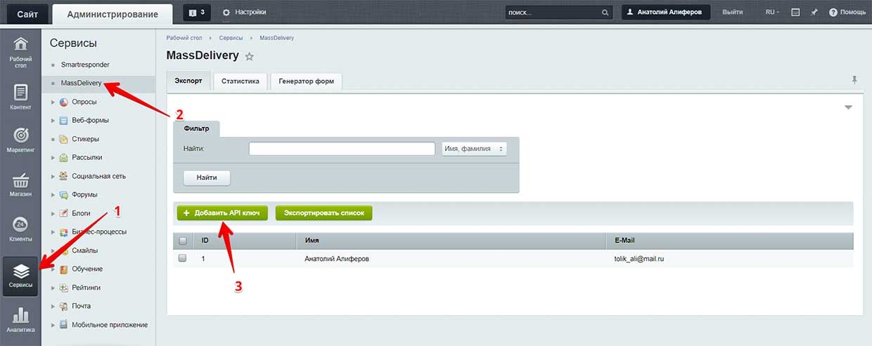 3. Затем перейдите в "Сервисы->MassDelivery". После этого вставьте из буффера обмена (CTRL+V) Ваш API-ключ.