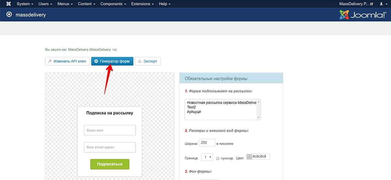 5. Если API-ключ был принят успешно, то расширение об этом сообщит Вам и затем Вы можете приступать к работе. Первый доступный Вам раздел расширения это генератор форм подписки