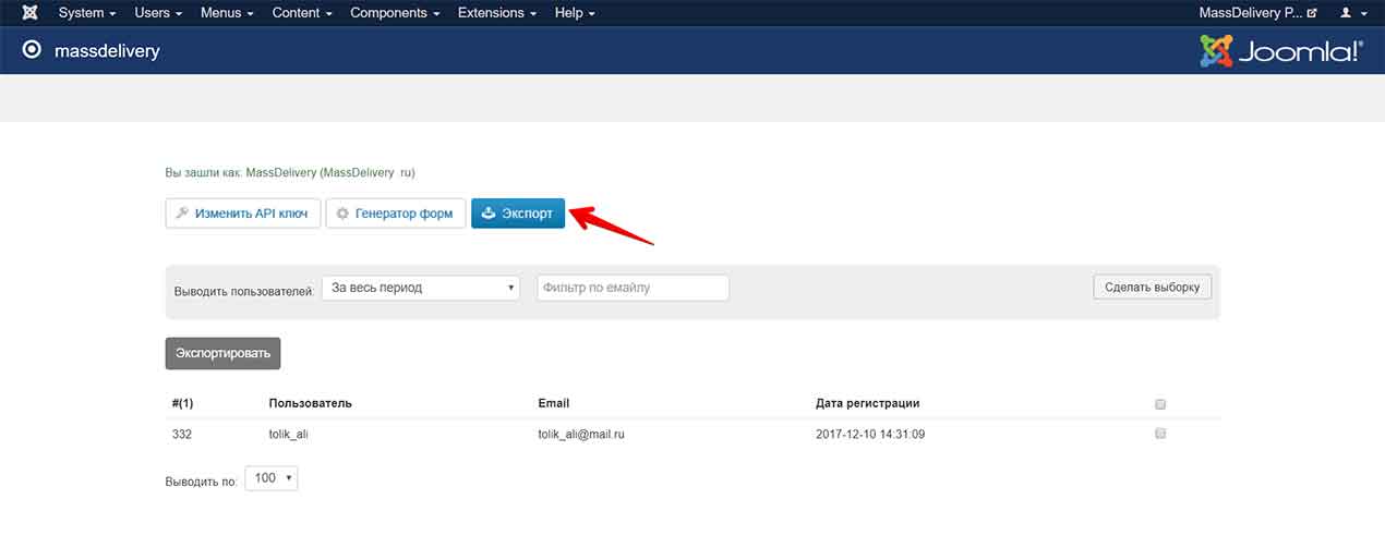 6. А следующий раздел расширения предназначен для переноса списка зарегистрированных в Joomla пользователей в Ваш список подписчиков на сервисе MassDelivery.